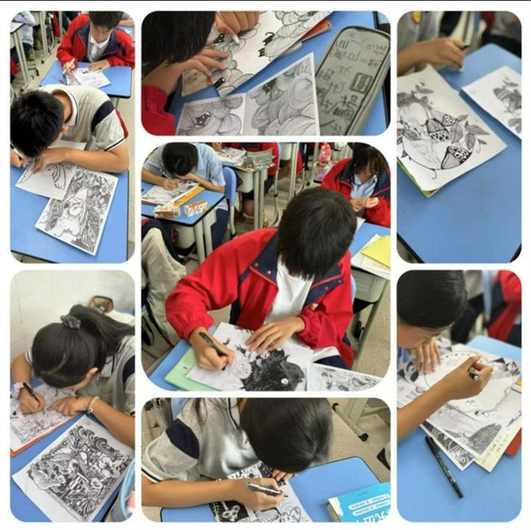 援线条作灵药,引色彩为心灯。受艺术治疗与正念理论的启发,我们将曼陀罗绘画活动引入心理课。让孩子在固定圆形框架内进行自由创作,在美的世界中纵情翱翔,从而降低焦虑感受,实现压力释放,激发自我表达。