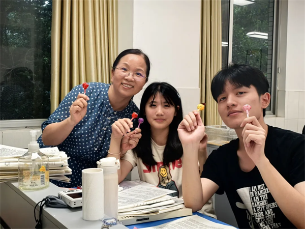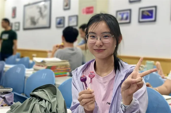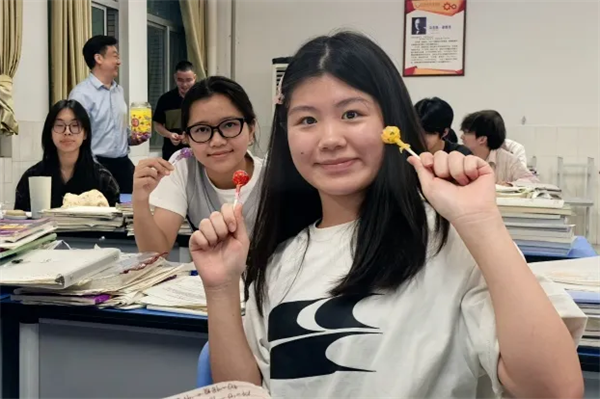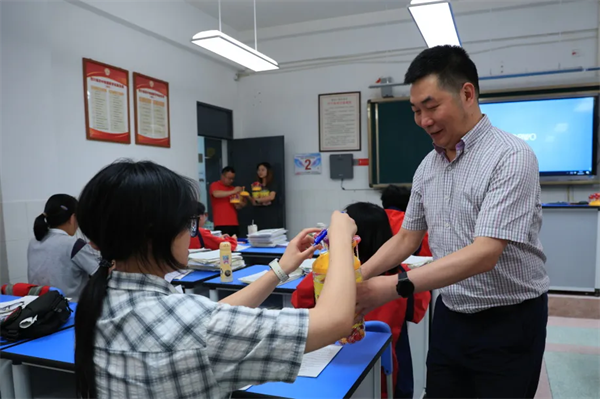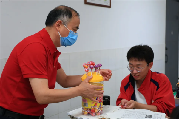 校领导班子为每位学子送上精心准备的棒棒糖。一颗颗红艳艳的棒棒糖,不仅承载着“红红火火”的吉祥寓意,更寄托着“独占鳌头”的美好祝愿。学子们接过糖果,惊喜与感动溢于言表。这份别出心裁的礼物,既是甜蜜的减压剂,更是信心的强心针。有学生笑着说:“吃了这颗糖,答题一定‘棒’!”教室里欢声笑语,紧张的氛围瞬间化为温暖的动力。