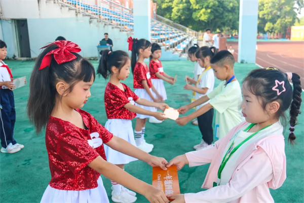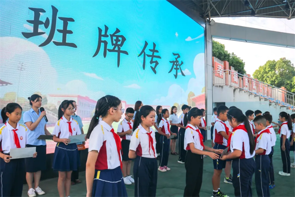 班牌,是班级精神的图腾,是成长记忆的载体。高年级学生郑重地将班牌交到弟弟妹妹手中——这不仅是一次仪式,更是一份信任的传递、一种精神的延续。从此,童年与成长并肩,荣誉与责任同行。