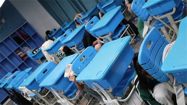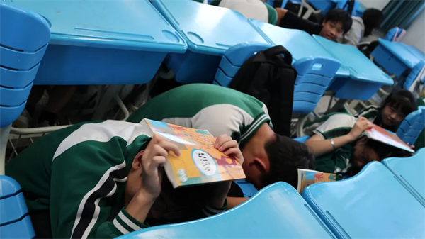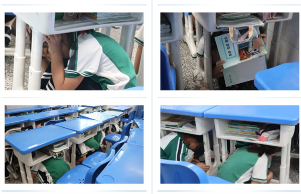 9:00,演练总指挥宣布“2025年秋期开学安全大演练现在开始”,防空警报应声响起,各班同学立即按照老师所教方法进行室内躲避,有的躲在课桌下,有的躲在墙角,有的用书包紧紧护住头部。