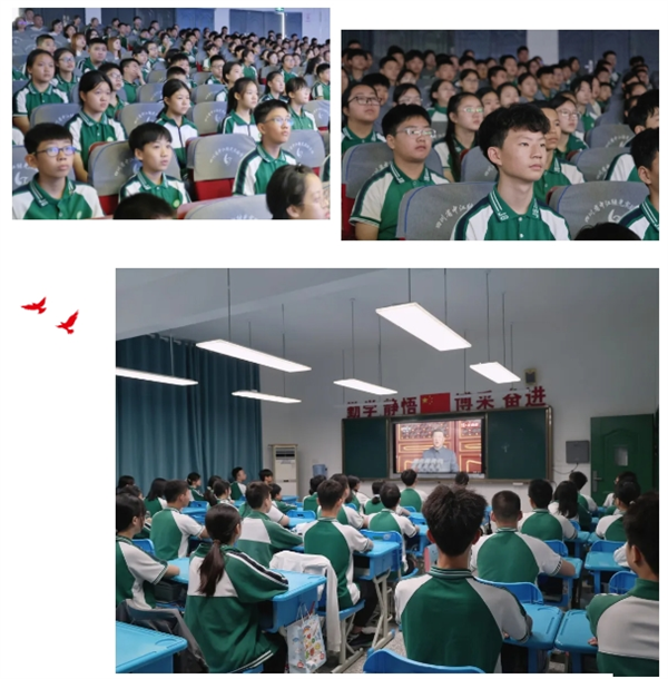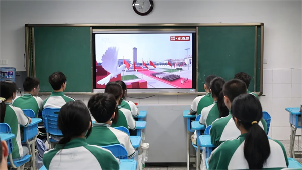 铿锵的脚步声从屏幕中传来时,初中部的同学们正襟危坐,光影掠过他们的瞳孔,映出呼啸的战车与猎猎战旗。此刻,同学们的心跳与正步同频——青春与祖国,在同一节拍里共振成雷。